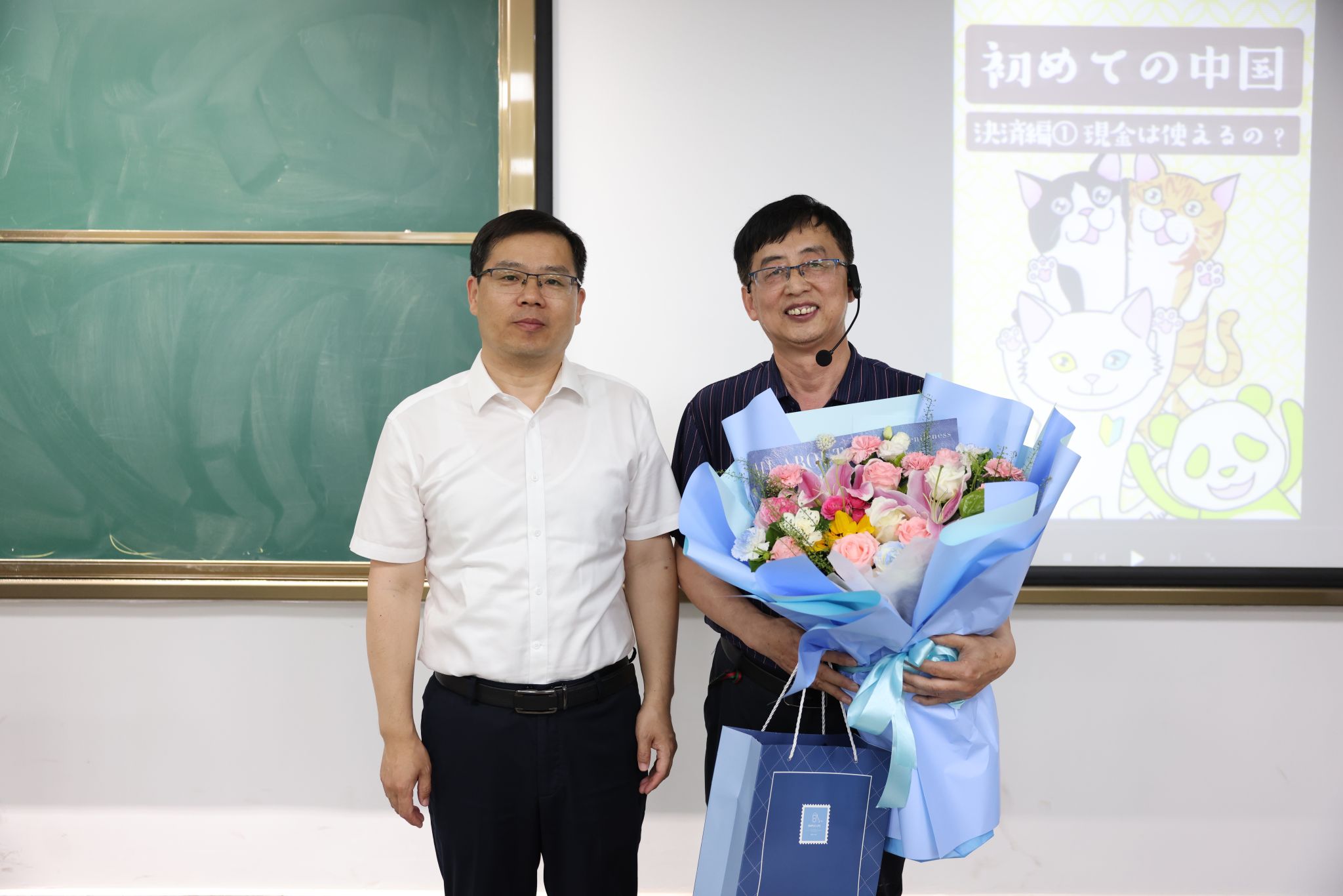 6月19日下午,学校在第五教学楼B207为执教三十七载的王长春老师举行了一场温馨而庄重的“最后一课”献花仪式。副校长曹江涛出席献花仪式,教务处处长李会鹏,外国语学院院长孙莉,党委教师工作部副部长、人事处副处长王莉及大学日语班全体同学参加献花仪式,仪式由王莉主持。